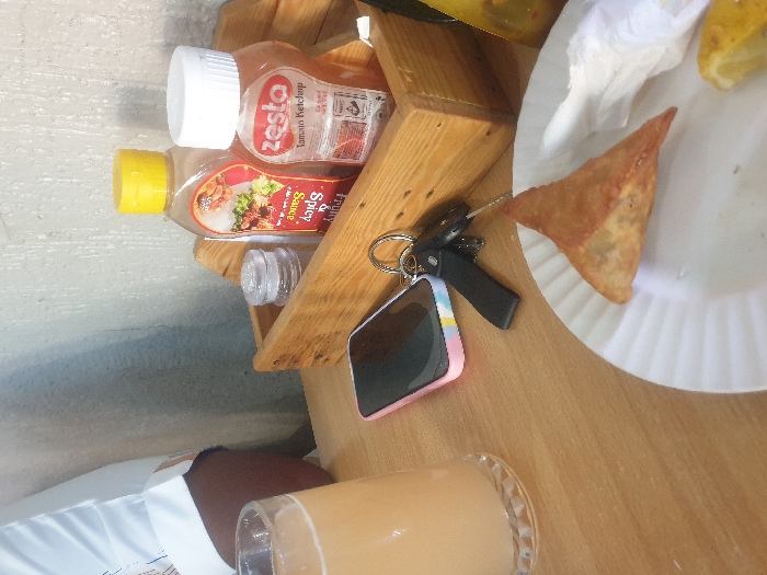 An elevated, close-up interior scene depicts a light wooden table surface and a textured light-colored wall in Machakos Central ward, Kenya. A partial view of a person wearing a white collared shirt occupies the upper left quadrant. On the table, a wooden caddy contains two plastic bottles: one with a yellow cap and a partially visible "Spicy Sauce" label, and another with a white cap labeled "Zesta Tomato Ketchup". A small clear plastic shaker is also present within the caddy. To the left of the caddy, a clear glass with a ribbed base holds an opaque light brown beverage. A black smartphone with a pink and multi-colored striped protective case lies face down on the table, next to a set of keys attached to a black fob and a multi-colored fabric strap. On the lower right, a white paper plate with ridged edges holds a single golden-brown triangular samosa, a crumpled white paper napkin, and a yellow lemon wedge.