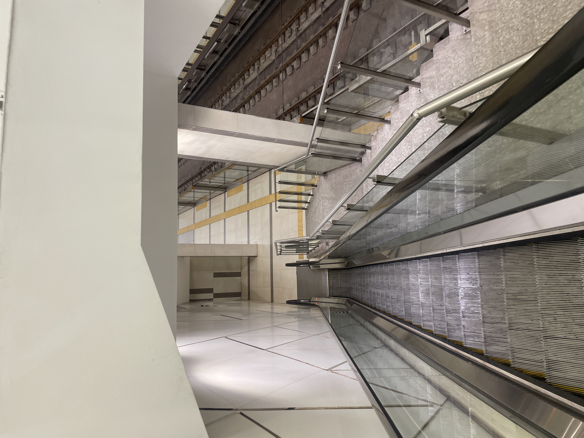 The image depicts an interior shot, likely a metro station, characterized by its modern architectural design. The location is speculated to be in Sofia, Bulgaria, based on architectural styles common in newly constructed or renovated areas. The scene includes escalators with glass railings leading upwards, concrete staircases, and overhead railway tracks, suggesting a public transportation hub. The flooring consists of large, light-colored tiles, creating a clean and open space. A massive white pillar dominates the left foreground, partially obscuring the view of the background. The environment seems sterile and unoccupied. The overall impression is one of a modern, functional, and possibly newly constructed or recently renovated transportation facility.