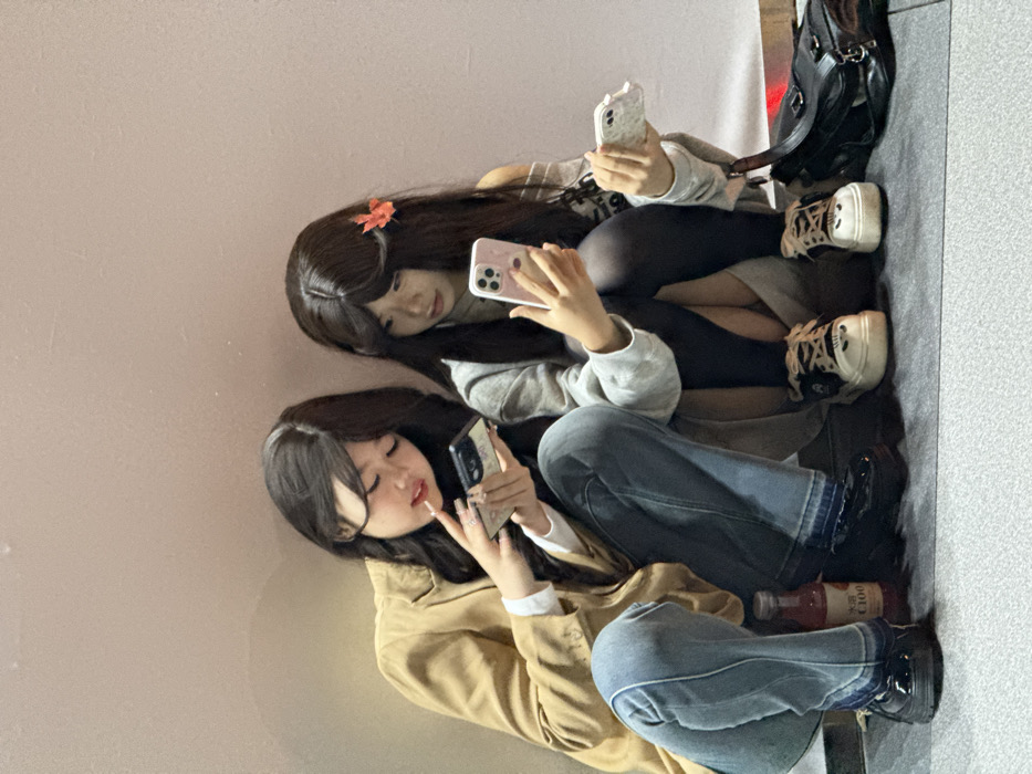 Two East Asian females are depicted squatting against a plain, light-colored wall on a dark gray floor in Yuzhong District, China