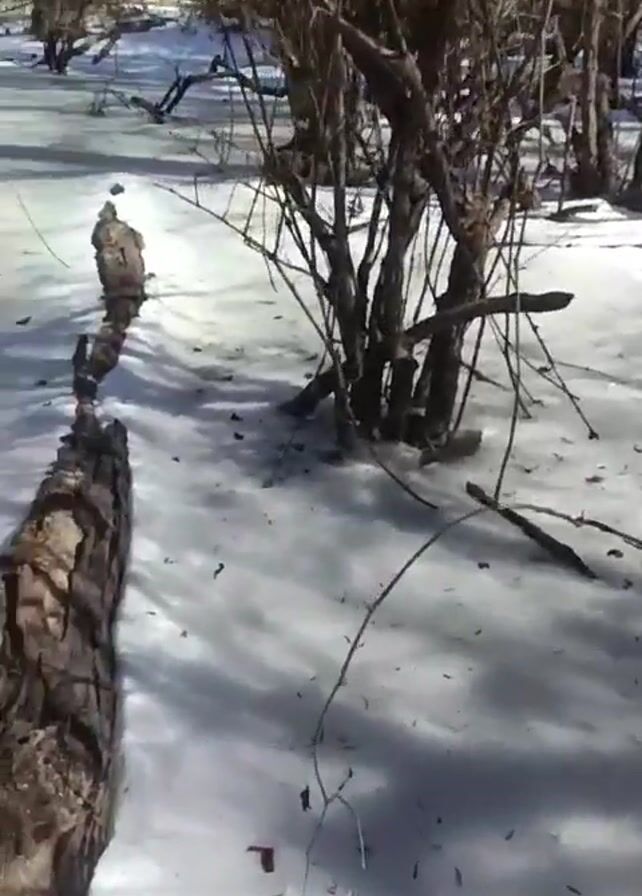 snow-covered or icy landscape with trees. The ground is mostly white with visible scattered twigs and debris. Several bare trees stand throughout the scene, and a large log lies partially on the snow. The sky is visible between the branches. There is no sign of people or animals in the video. The camera moves slightly but the overall view remains static.