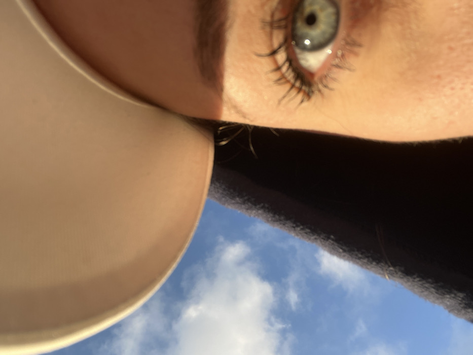 A close-up, low-angle photograph, taken in Playa Del Inglés, Spain, captures the right half of a human face against a clear blue sky with scattered white clouds