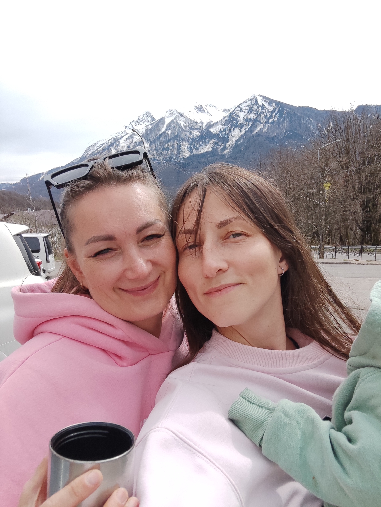 Two women pose for a selfie outdoors with snow-capped mountains in the background. The woman on the left wears a pink hooded sweatshirt and has sunglasses on her head. She holds a metal cup in her hand. The woman on the right wears a light pink sweatshirt. A child's arm and hand in a light green sweatshirt are partially visible. The location is Krasnaya Polyana, Russia, as indicated by the mountain range. Bare trees and a street are visible in the background.