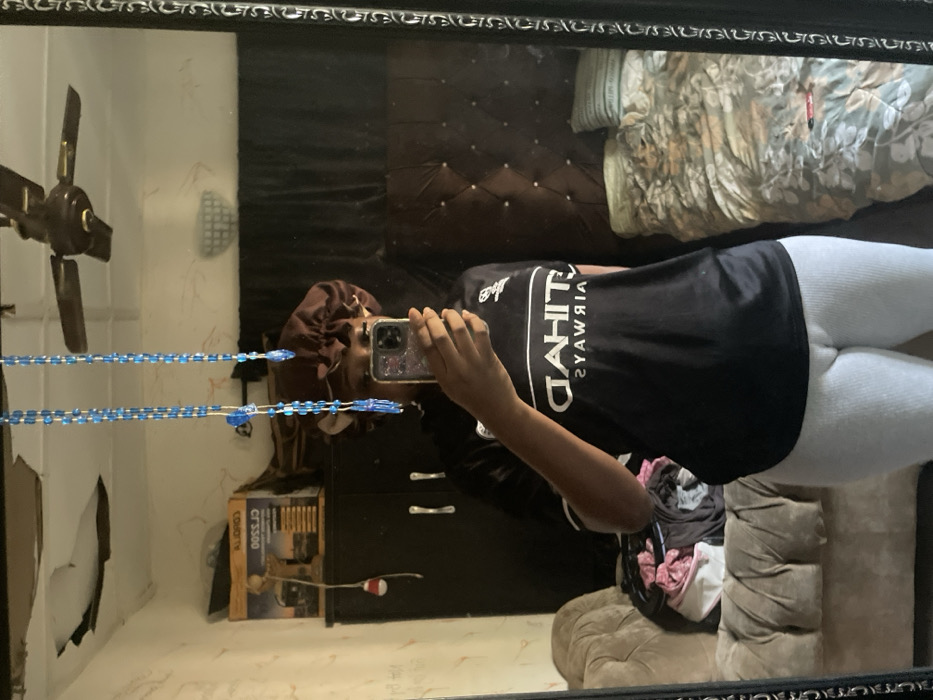 This image depicts an indoor scene in Ajaokuta, Nigeria, captured as a mirror reflection. A single individual, presumably female, is centered in the frame, taking a selfie with a smartphone held to obscure her face. She wears a brown satin sleep bonnet, a black short-sleeved t-shirt with the reversed "ETIHAD AIRWAYS" logo in white, and light grey ribbed leggings. The background, visible in the mirror, shows a room with a damaged ceiling featuring peeled plaster and paint, revealing a darker surface underneath. A brown three-bladed ceiling fan is mounted. Two strands of blue beaded decorations hang vertically in front of the mirror. To the left, a dark brown or black two-door wardrobe with silver handles is visible. On top of the wardrobe, a brown cardboard box labeled "CROWN" and "CL 3500" (reversed) is present, along with other indeterminate objects. A small white and red object, possibly a decoration, hangs near the wardrobe. Below the wardrobe, a light-colored, tufted armchair or sofa is partially visible, with a pile of folded clothes in various colors (pink, black, white) on its seat. To the right, a dark brown tufted headboard with light-colored button details is against the wall. Below the headboard, a bed is made with a patterned duvet or blanket in shades of green, beige, and white. A small red object, possibly a marker or pen, rests on the bed. A small, round, white decorative object or light fixture is reflected on the upper right wall. The mirror itself has a dark, ornate frame.