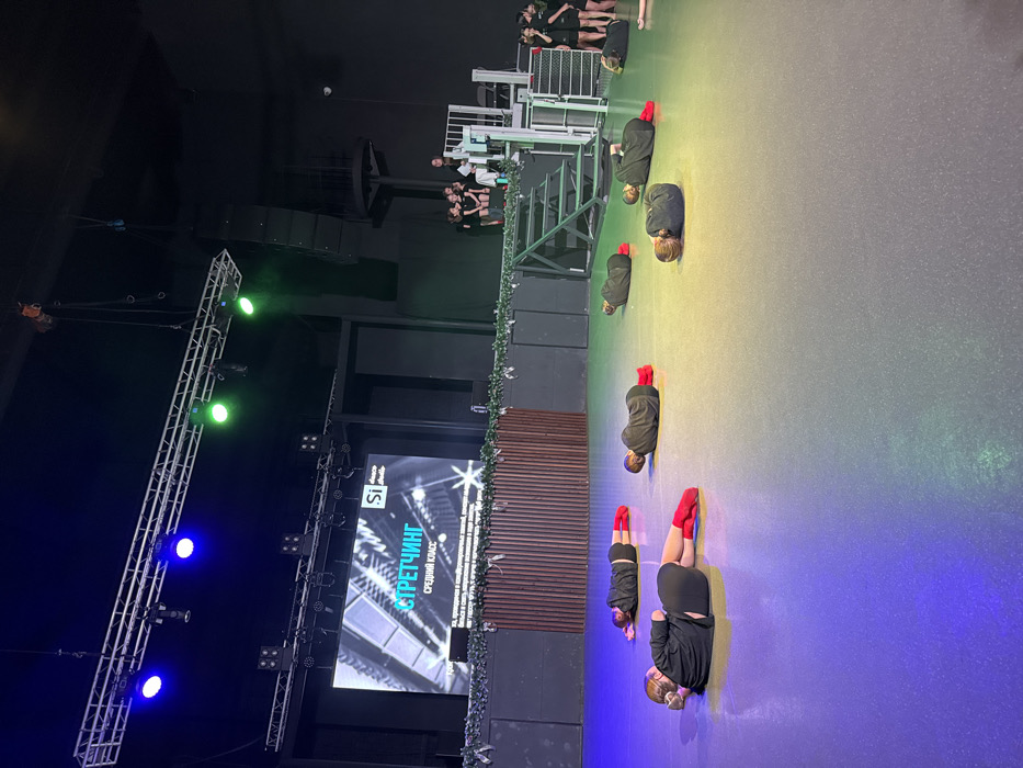 The image depicts an indoor dance or fitness studio located at Si Dance Studio, Aerovokzalnaya Street 10Zh, Krasnoyarsk, Russia. The scene is illuminated by overhead stage lighting, featuring a truss structure with active blue and green spotlights. A large LED screen on the stage backdrop displays the Russian text "СТРЕТЧИНГ" (STRETCHING) and "СРЕДНИЙ КЛАСС" (INTERMEDIATE CLASS), along with the "Si Dance Studio" logo. Below the screen is a decorative wooden paneling adorned with sparse greenery. The smooth floor, which transitions in color from blue/purple in the foreground to green and yellow further back, is occupied by at least six individuals. These individuals, primarily young females, are lying on their sides in a curled, fetal-like position. They are dressed in black athletic attire, with several wearing distinctive bright red socks or footwear. Their faces are largely obscured as they rest or stretch. To the right of the stage, an elevated platform with stairs is visible. A group of approximately 5-7 additional individuals, also appearing to be young females in black clothing, are gathered on or around this platform. One individual on the platform holds papers or a clipboard, possibly in an instructional or supervisory capacity. A large speaker stack is positioned to the right of the stage structure, and a white metal railing is present near the platform. The overall environment suggests an ongoing dance class or rehearsal.