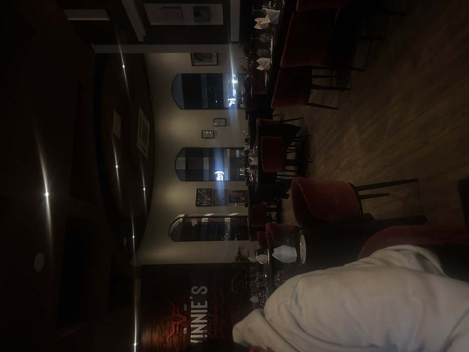 The image displays the dimly lit interior of Vinnie's Steakhouse, located in Spanish Town, British Virgin Islands. The establishment features a dark wood-paneled left wall with a large, illuminated "ESTD 2020 VINNIE'S Steakhouse" logo. The flooring consists of light-toned wood planks. In the immediate foreground, to the left, the back and upper left shoulder of a person wearing a light-colored hooded garment are visible, seated at a table. The main dining area is furnished with multiple tables draped in dark (likely black) tablecloths. Each table is set with white folded napkins, wine glasses, and water glasses. Accompanying these tables are numerous chairs upholstered in a reddish-orange or burgundy velvet fabric with dark legs. The rear wall is a light-colored, curved surface punctuated by several arched windows, through which a nocturnal urban scene is visible, characterized by streetlights and reflections. Framed artwork or decorative items are mounted on this wall between the windows, and also on the dark-paneled wall to the right. A large potted plant is situated near a table on the left side of the room. The dark ceiling contains several recessed spotlights, which produce visible light flares, and an air conditioning vent. No active interactions or significant movements are discernible from any individuals beyond the partially visible person. The restaurant appears to be largely unoccupied.