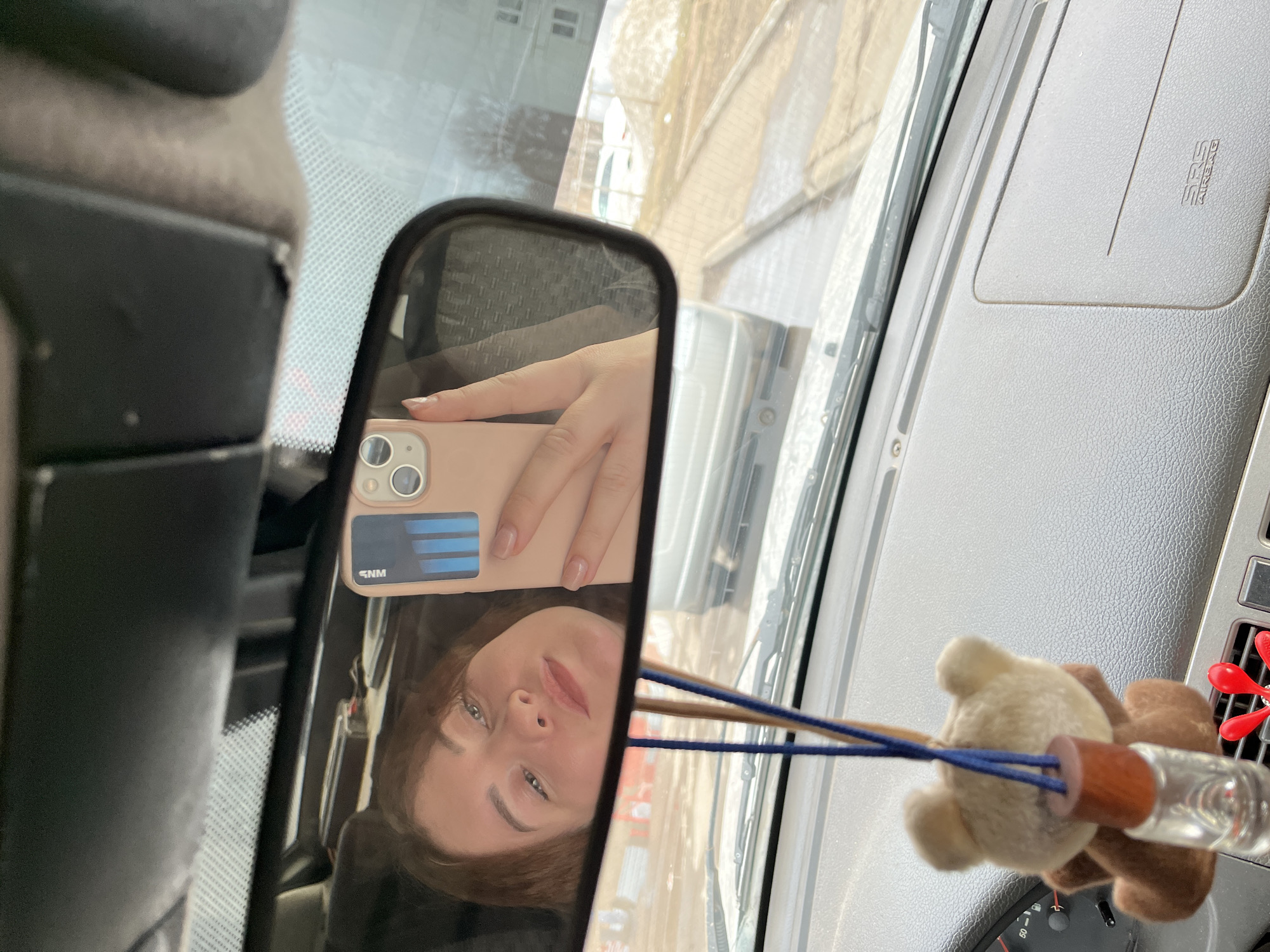 interior of a car, with a woman taking a selfie in the rearview mirror