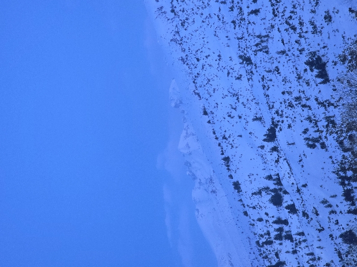 The scene depicts a panoramic view of a snow-covered mountain landscape in Panichishte, Bulgaria. The upper two-fifths of the image are occupied by a clear, deep blue sky. The lower three-fifths present a steep mountain slope blanketed in white snow, extending from the foreground into the mid-distance. Scattered across this snow-covered terrain are numerous small, dark coniferous trees, irregularly distributed, appearing as dark clusters against the white. In the distant background, lighter, snow-capped mountain peaks are visible, with faint, wispy clouds or atmospheric mist partially obscuring some of their upper sections, particularly on the left side of the frame. No human subjects, animals, or man-made objects are present. The environment is characterized by cool blue and white tones, indicative of a winter setting.
