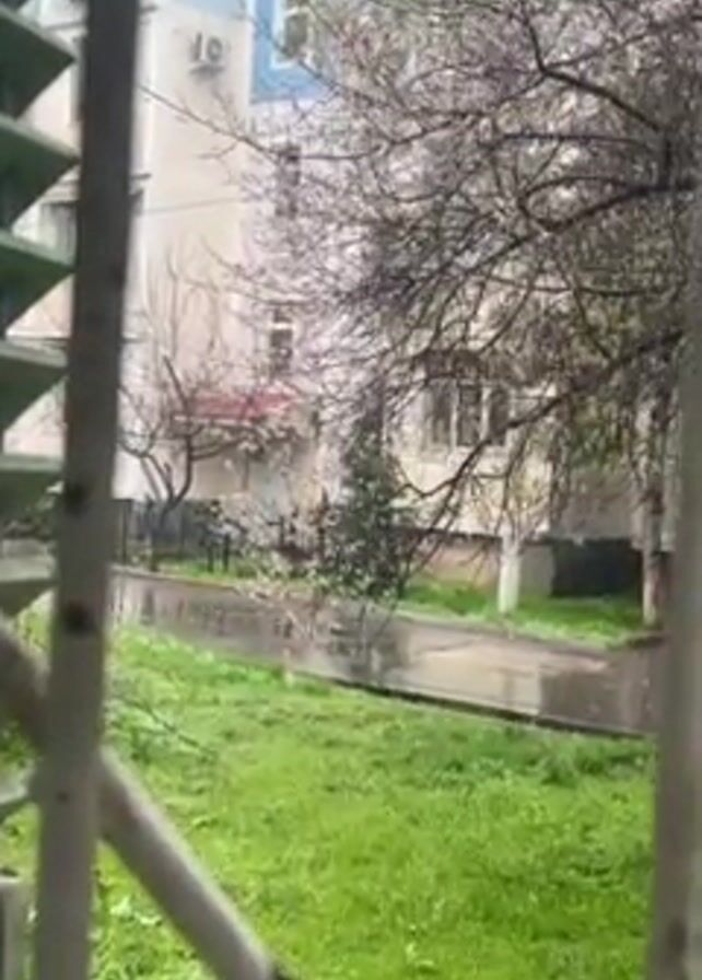 The view through a metal-framed window shows an outdoor scene on a rainy day. A building with a white and blue facade is visible across a grassy lawn. Trees are present, some with bare branches and others with sparse white blossoms. A wet concrete path runs through the lawn. Raindrops are visible on the path and the grass. The view is partially obstructed by the metal frame of the window. The blinds are partly closed on the left side of the window.