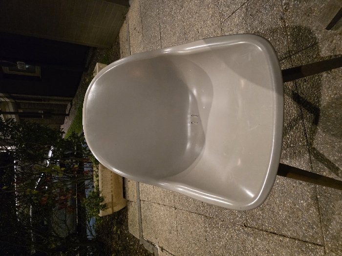 - "A light-gray chair, seen from an overhead angle, dominates the right side of the frame, its smooth, curved surface contrasting with the textured, stone-like ground beneath" by FM-PPRef1, licensed under CC BY 4.0