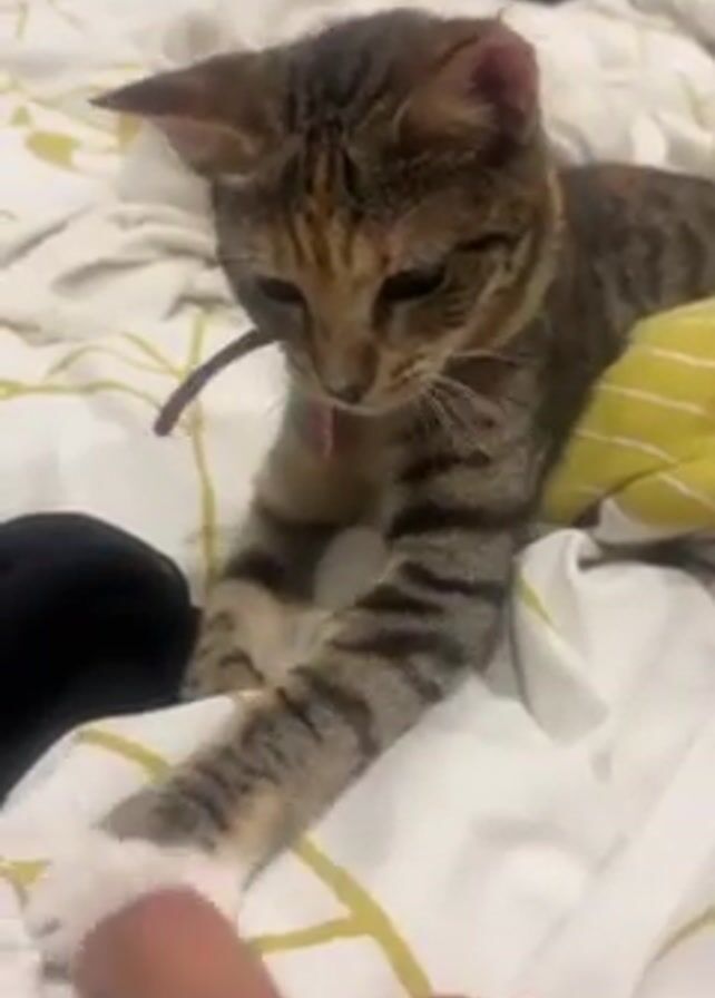 A close-up shot shows a person's index finger gently poking the paw of a tabby cat lying on a bed