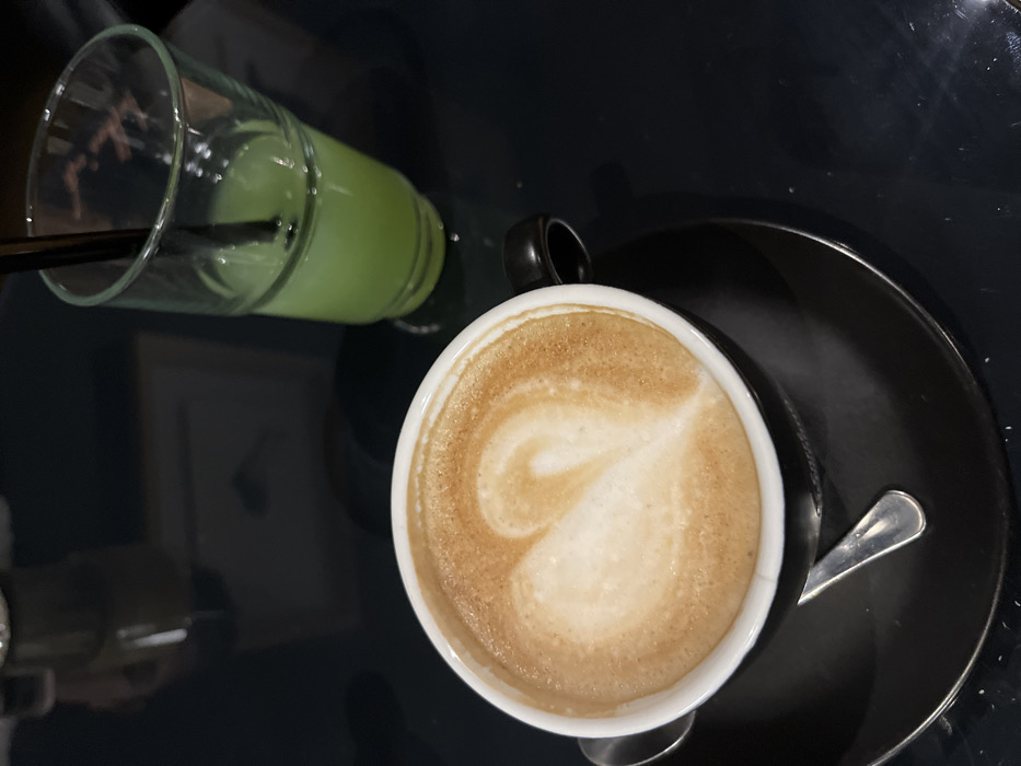 An overhead view depicts two beverages on a dark, reflective table surface in an establishment located in Stara Zagora, Bulgaria