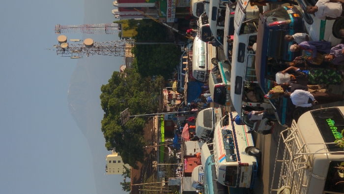 A bustling street scene showcases rows of white minibuses packed with people. Some individuals stand near the vehicles, possibly interacting or boarding. In the background, a lush canopy of green trees fills the space, with cell phone towers standing tall on the left and a snow capped mountain behind them. Buildings line the street, blending into the vibrant backdrop of this busy urban area.