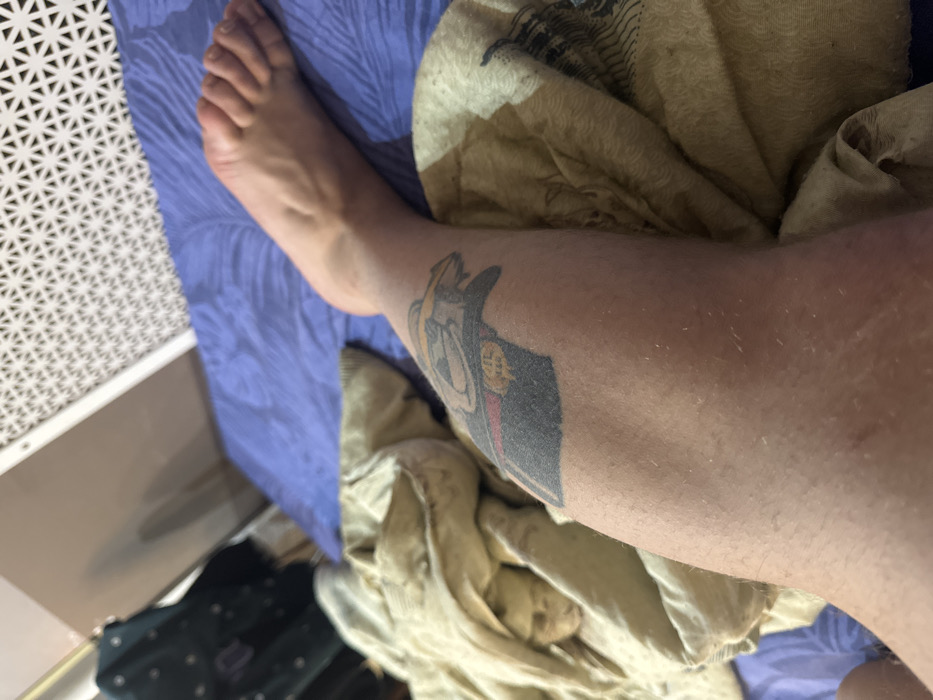 A close-up angled shot shows a person's leg lying on a blue patterned surface, likely a bed. The leg has a cartoon tattoo of a wolf wearing a police uniform and hat. A foot is visible near the top left corner. Off-white crumpled fabric is draped around the leg. The background features a patterned white and brown wall, with a glimpse of dark clothing near the bottom left.