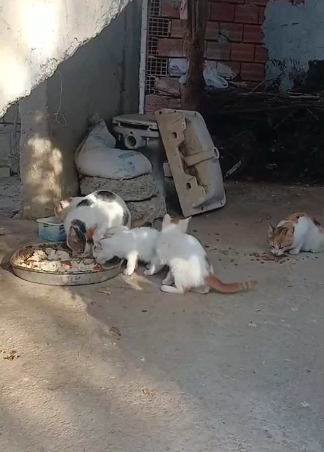 four cats eating from different locations on the ground. Three of them are near a round metal tray with chunks of food, one eating from it, while the other two are close by, presumably eating fallen pieces. The fourth cat is further away, eating from kibble scattered on the concrete surface. The setting appears to be an outdoor area near a building, with various objects, including a toilet bowl, bags, and a dirty metal panel, placed against the wall. Sunlight casts shadows on the ground.