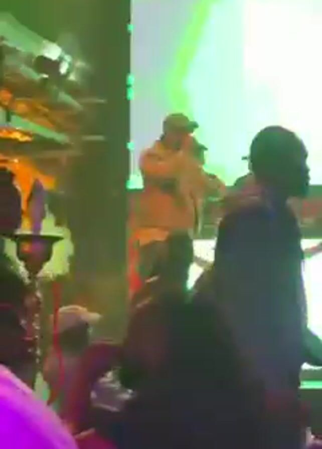 crowded indoor event at a club or party, with a large screen in the background displaying an image of a person with the words "RED $ATI LIVE" and "CHILL AREA FRIDAYS" below. People are standing and moving around in the foreground, some with their backs to the camera. A person on a small stage appears to be performing, singing into a microphone. The lighting is colorful and somewhat dim, with a party atmosphere. The screen's colors shift from green and blue to red and orange.