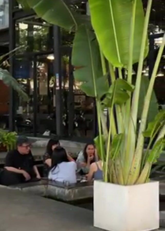 exterior of a modern-looking building, possibly a cafe or restaurant, with a unique outdoor seating area. Several groups of people are visible in the seating area, which appears to be a sunken, water-filled space with concrete edges. Some people are seated at tables, eating and chatting. A man is sitting alone with a laptop in the water-filled space, adjusting his hair. The building has large glass windows with a black metal frame, allowing a view of the interior, which includes tables, chairs, and lighting fixtures. Lush greenery, including large banana plants in white square planters, surrounds the seating area. The video is taken from a slightly elevated angle, providing a comprehensive view of the scene.
