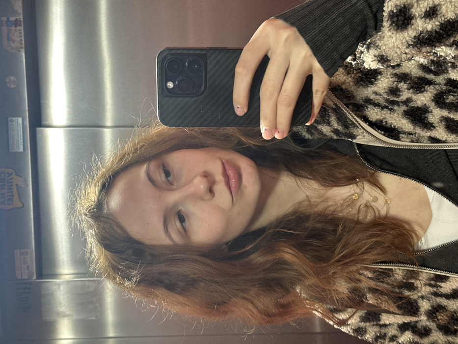 The image displays a young woman taking a selfie in an elevator located in Novi Sad, Serbia. The subject is a young woman with fair skin, reddish-brown wavy hair, and a natural facial expression with a slight smirk. Her eyes are directed towards her right, looking into her reflection rather than directly at the camera lens. She wears a black and beige/cream leopard-print fleece jacket, open at the front, over a dark ribbed garment and a light-colored undershirt. Two delicate necklaces with small charms, one golden and one lighter, are visible around her neck. She holds a black smartphone in her left hand, partially obscuring the lower right portion of her face. The phone has a triple-lens camera system and is encased in a dark, textured carbon fiber-patterned case. Her fingernails are manicured with a clear or pale polish, each featuring two small, dark dots near the cuticle. The background consists of polished metal elevator doors, likely stainless steel, exhibiting reflections of overhead lighting and faint smudges. Visible on the upper part of the reflective doors are several stickers: a yellow rectangular sticker with inverted and mirrored black text reading "UNITE CAN HV BUNNY", and other less distinguishable rectangular stickers with text and graphics. Vertical seams are apparent where the elevator doors meet.