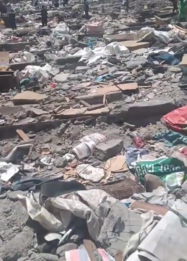 debris-filled landscape with concrete blocks, rubble, personal belongings, and trash strewn across the area
