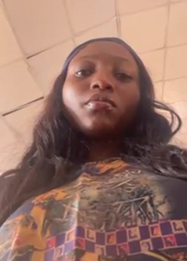 A woman with dark hair and a blue headband is looking up at the camera. She is wearing a colorful patterned top. The background is a white tiled ceiling.