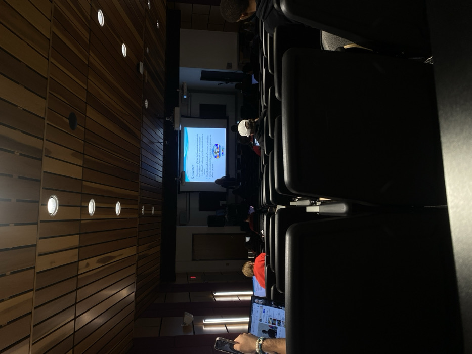The image depicts a dimly lit lecture hall or auditorium in Lawrence Township, United States, viewed from the rear audience perspective