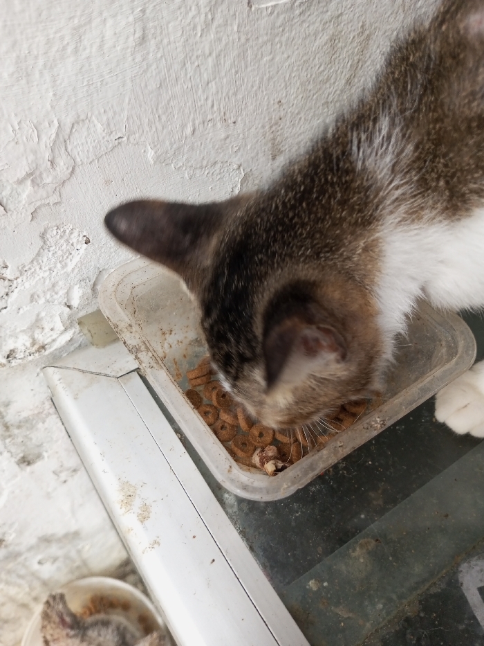 - "A cat with brown and white fur eats from a clear, dirty plastic container filled with dry, donut-shaped cat food" by FM-c1NEk2, licensed under CC BY 4.0