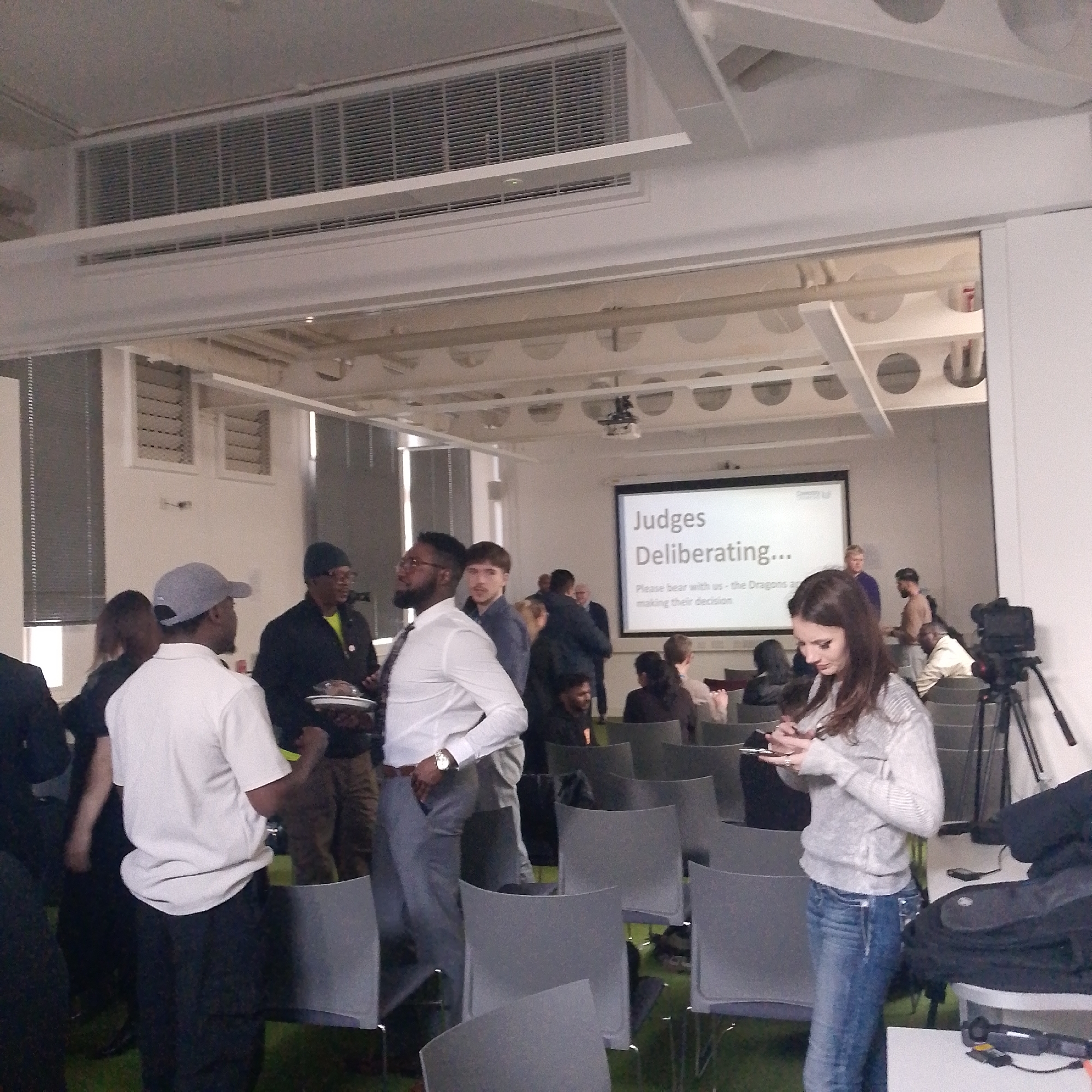 An indoor scene within a modern event space at Coventry University, Coventry, United Kingdom, is depicted. The room features white walls, a white ceiling with exposed cellular beams, integrated linear diffusers, and rectangular ventilation grilles. Large windows with vertical blinds are visible on the left. The floor is covered in green material, possibly carpet or artificial turf. Grey chairs are arranged in rows, with many unoccupied. In the background, a projector screen displays the text "Judges Deliberating..." and "Please bear with us - the Dragons are making their decision" with a "Coventry Uni" logo at the top. This indicates a pause during a competition or event. Approximately 15-20 individuals are present, predominantly adults, standing and mingling. In the foreground right, a young woman with long brown hair, wearing a grey long-sleeved top and blue jeans, stands looking down at a smartphone in her hands. To her right, a black video camera on a tripod is positioned, facing the projector screen, suggesting the event is being recorded. A black bag and some small objects are on a white surface next to the camera. In the mid-ground, a man wearing a white long-sleeved shirt, grey trousers, and glasses stands with his hands in his pockets, looking left. Near him, another man in a black jacket and black beanie holds a white plate. Further left, a man in a white short-sleeved shirt and grey baseball cap stands with his back partially to the camera. Other individuals are scattered throughout the room, some holding plates, others engaged in conversation or observing the scene. Overhead lighting illuminates the space.