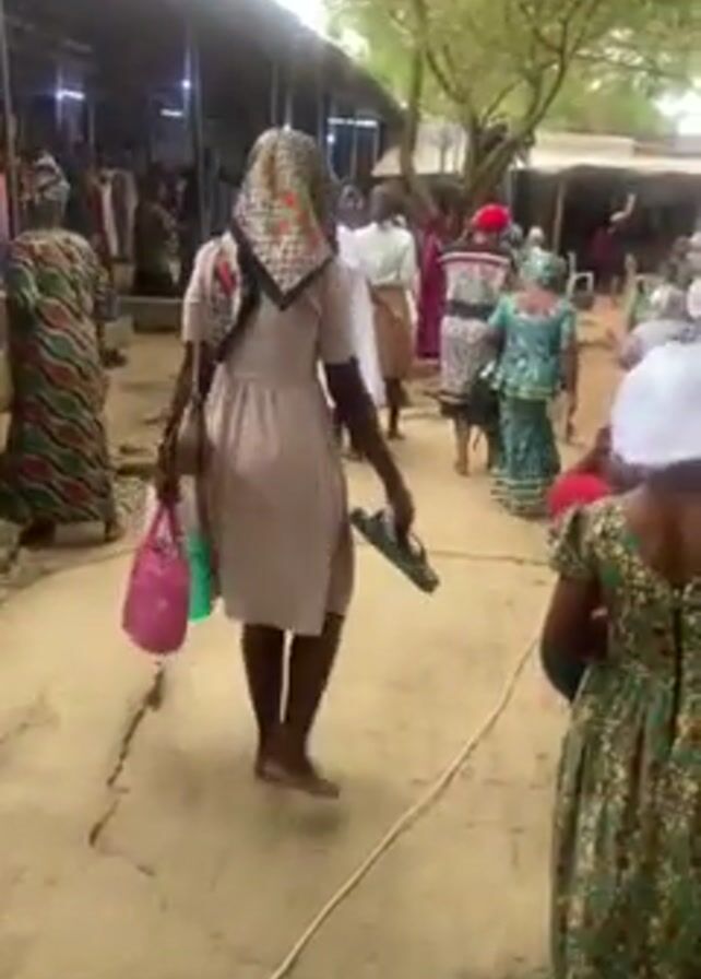 large group of people, mostly women, walking on a sandy, uneven path. Many of them are wearing traditional clothing and head coverings. Some people are holding items such as bags and shoes. They are walking towards a covered area with buildings and trees visible in the background. Some are on raised concrete platforms. The environment appears to be outdoors, possibly a religious gathering or event. The overall impression is one of a busy, communal atmosphere.