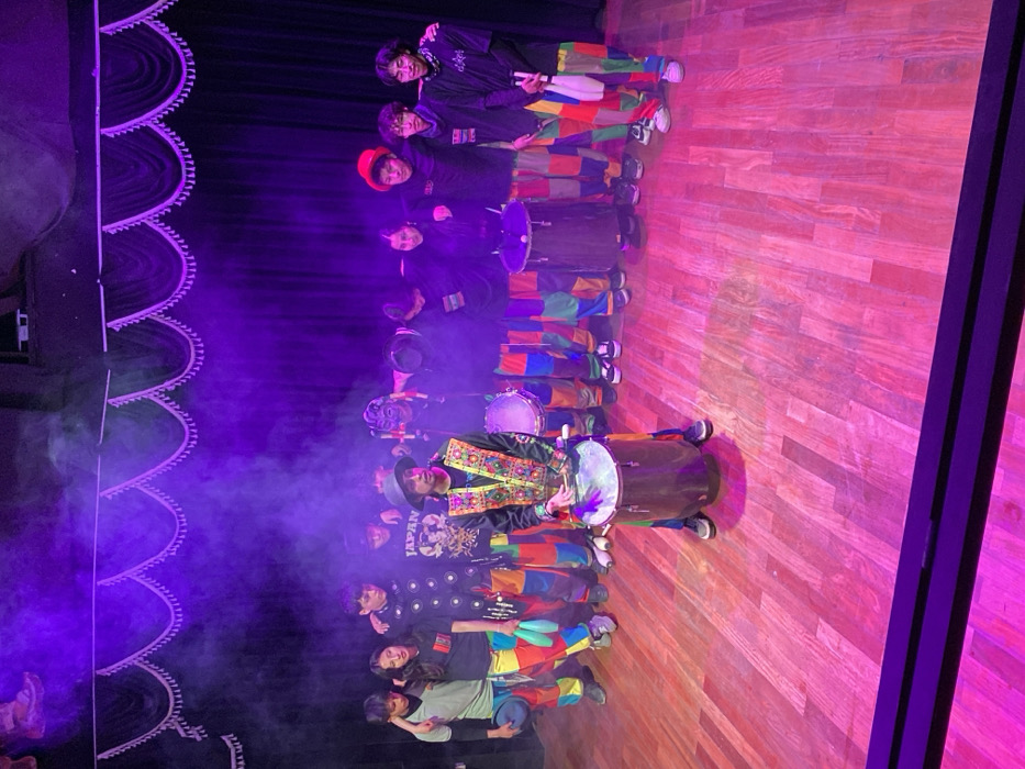 The image depicts a group of approximately thirteen young individuals on an indoor stage, illuminated by strong purple lighting and atmospheric haze. The stage floor is light-colored wood, and the backdrop consists of dark curtains topped with decorative white fringed valances. In the foreground, slightly to the left of center, a male figure is actively playing a bongo or conga-style drum. He wears a dark wide-brimmed hat, a black long-sleeved jacket, and a vibrantly embroidered, multi-colored vest or panel across his chest. The remaining individuals are positioned behind and to the sides of the central drummer, forming a semi-circular line. Most are wearing multi-colored, patchwork-style pants, predominantly in bright primary and secondary colors, paired with dark or patterned tops. One individual to the central drummer's right wears a distinctive mask with white, red, and black patterns and holds a hand drum. Further to the right, another person is actively playing a djembe-style drum. The individual on the far right holds two white juggling clubs. Several members of the group have their arms around each other's shoulders. The scene takes place on a performance stage within an indoor venue in El Alto, Bolivia. The specific name or address of this venue is not identifiable from the visual content of the image.
