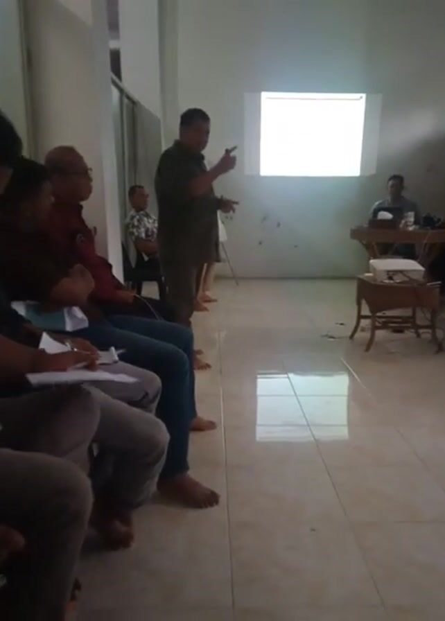 Here's a detailed description of the video: The video shows a group of people inside a room, seemingly at a meeting or seminar. A man in a brown shirt and pants is standing and speaking, gesturing with his hands, seemingly presenting information on a screen. The screen is white and brightly lit. Several people are sitting on the floor, with their feet visible towards the camera. Some are taking notes on paper. Another man is sitting on a chair in the background. The room has white walls and tiled flooring. Light reflects off the floor. The video appears to be shot from a low angle.