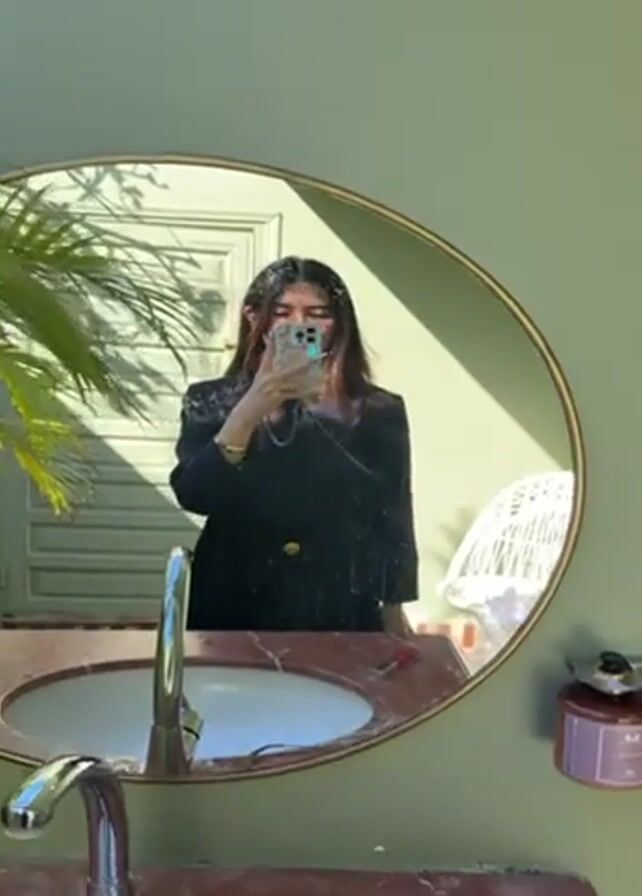 A woman takes a selfie in a round mirror in a bathroom. The woman is wearing a black jacket with gold buttons, and her hair is dark and shoulder-length. She is holding her phone in front of her face. The mirror is mounted on a light green wall. Below the mirror is a sink with a marbled counter. A plant is partially visible in the reflection of the mirror. Light streams in through a doorway or window reflected in the mirror.