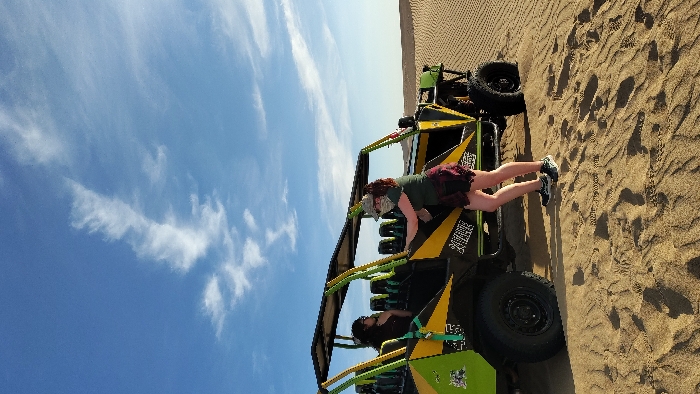 - "The image depicts a multi-passenger dune buggy halted on extensive sand dunes under a clear blue sky with scattered wispy clouds" by FM-Iwr2P2, licensed under CC BY 4.0