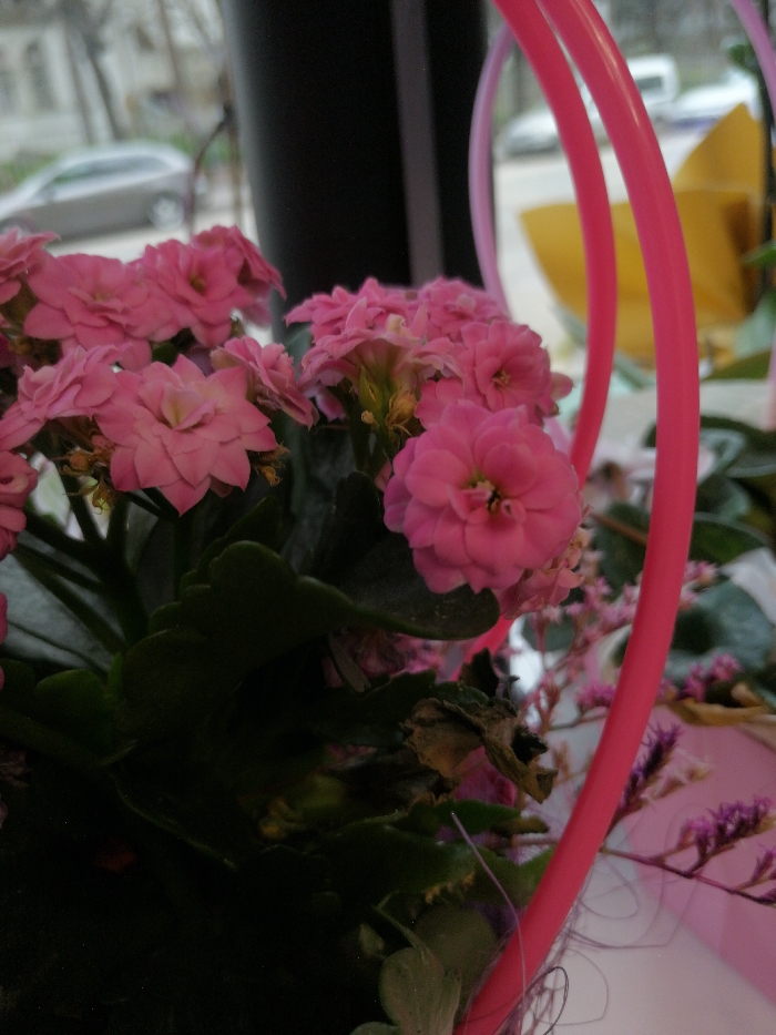 The image displays a close-up of a vibrant potted plant, primarily composed of numerous densely clustered pink flowers, consistent with a Kalanchoe variety, and dark green, scalloped leaves. Some leaves exhibit minor browning or desiccation. Two bright pink, arching plastic decorative elements are positioned behind and to the right of the main floral cluster. Further to the right, a muted pink/purple dried flower arrangement and a large yellow-wrapped object are partially visible. The scene is set indoors, looking out through a dark-framed window. Outside the window, a blurred urban or suburban environment is visible, including a silver-grey automobile on a street and indistinct building structures. No individuals are present. The location is Unknown, Unknown.