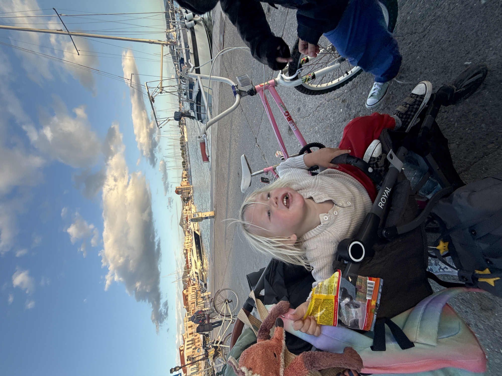 The image presents a detailed view of a harborside promenade in Aegina, Greece, under a partly cloudy sky during late afternoon or early evening. In the foreground, a young child with blonde hair, dressed in a light-colored long-sleeved top and red trousers, is seated in a black stroller marked "ROYAL." The child's mouth is slightly open, and they hold a yellow "Haribo Goldbären" snack bag in their right hand. A brown, fox-like stuffed animal rests to the child's left within the stroller, which also contains a rainbow-patterned blanket and a dark bag adorned with yellow star-shaped accessories. To the immediate right, the lower torso and right arm of an individual, wearing a dark top, blue trousers, and light-colored sneakers, are visible. This individual's hands are positioned near the handlebars and front wheel of a pink "HERO" brand BMX-style bicycle with white components. The subjects are positioned on a grey paved surface consistent with a pedestrian walkway. The midground features the Aegina harbor, where numerous sailboats and at least one white motor yacht are moored. Their masts are prominent against the sky. Along the waterfront, a continuous line of multi-story buildings with traditional Greek architecture and varied roof colors, including terracotta, is visible. A distinctive building with a red dome is situated on the far right of the waterfront structures. To the left of the main subjects, another individual is seen walking alongside a light-colored bicycle equipped with a rear basket. Distant mountains are faintly discernible behind the town. The sky is clear blue with scattered white cumulus clouds.