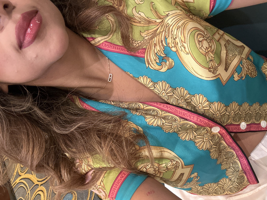 A woman with wavy brown hair, fair skin, and glossy lips poses in a vibrant patterned top. The cropped Versace blouse features a turquoise base adorned with ornate gold and beige designs, framed by a pink border imprinted with the Versace logo. A delicate gold necklace with a horizontal pendant rests on her chest. The background is a mix of dark and neutral colors.
