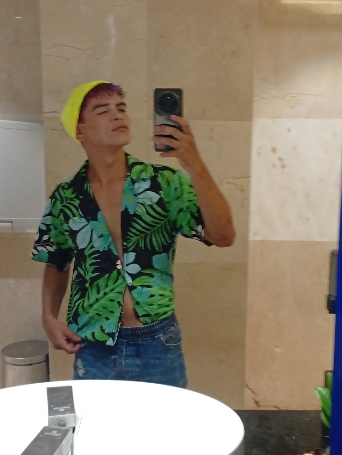A young man takes a selfie in a bathroom. He wears a bright yellow beanie and a green, black, and blue tropical-print shirt, partially unbuttoned, revealing a blue denim skirt or shorts with an elastic waistband. His hair appears dyed a reddish-purple hue. The bathroom has tan marble walls, a white countertop with a square chrome fixture, and a gray trash can visible in the background. He holds a smartphone up, capturing his reflection.