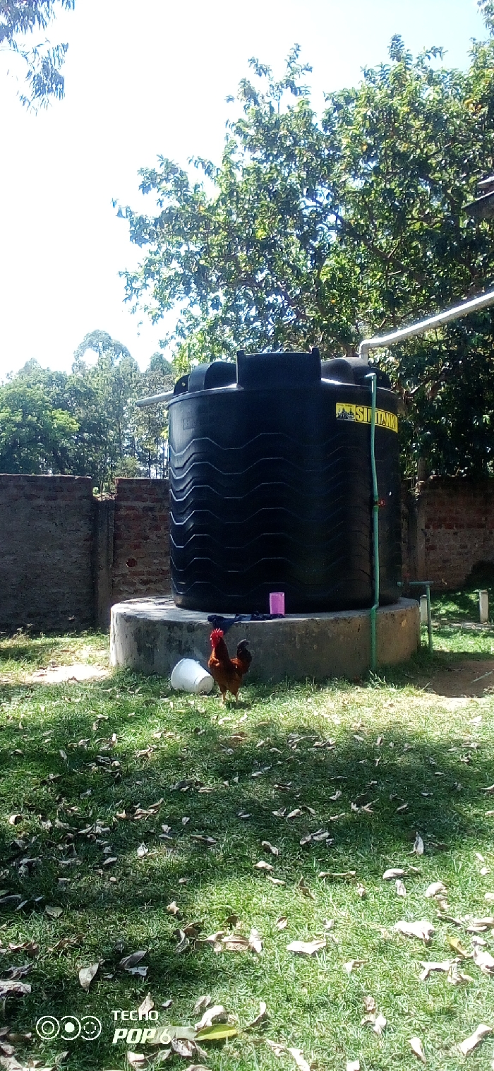 The image depicts an outdoor scene located in Mahiakalo ward, Kenya, under bright daylight. A large, black, corrugated cylindrical plastic water storage tank, marked with the brand "SITATANK," rests on a raised, circular concrete foundation. A white PVC pipe system is visible connecting to the top right of the tank, with a green hose containing a red valve descending vertically along the tank's side. On the concrete foundation, a pink plastic cup and a dark fabric item are present. A brown and black rooster, distinguished by a red comb and wattle, stands on the grassy ground directly in front of the water tank. Adjacent to the rooster, a white plastic bucket lies on its side. The grass is scattered with numerous dry, fallen leaves. The background features a low, unplastered brick wall behind the tank, extending beneath a dense canopy of green trees.