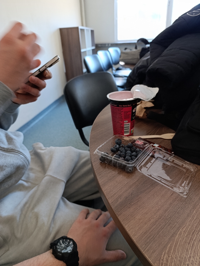 An indoor scene in the city of Silistra, Bulgaria, features a partial view of two individuals within a functional room. In the left foreground, a person is seated, wearing a light grey hooded sweatshirt and matching sweatpants. Their left arm rests on their lap, displaying a black digital watch on the wrist. Their right hand, blurred from motion, holds a silver-colored smartphone. A dark brown round table occupies the right side of the frame. On this table, a red plastic cup of "Sour Cherry Quark" yogurt is present, with its foil lid partially peeled back. Adjacent to the yogurt is an open clear plastic container filled with blueberries in one section, and a light-colored wooden utensil. A dark, possibly puffer, jacket is draped over a chair, partially resting on the table, indicating the presence of a second person. The background reveals light-colored walls, a blue-grey floor with a darker accent stripe, a window allowing daylight, a dark brown shelving unit, and two black office chairs.