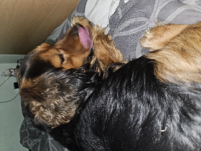 - "A medium-sized domestic canine, primarily black-furred on its torso and hindquarters, with sections of brown and tan fur on its head, ears, and one visible foreleg, is depicted in a reclined position" by FM-l2gGi1, licensed under CC BY 4.0
