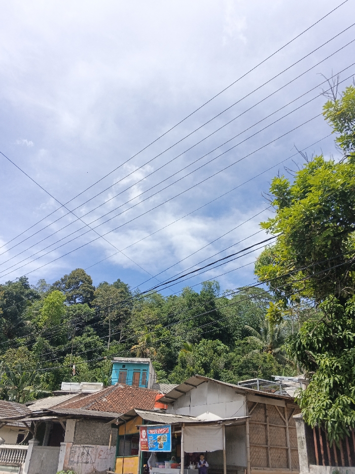A vibrant landscape features houses with red-tiled and corrugated metal roofs. Lush green trees cover a hill, contrasting with a bright blue sky filled with scattered clouds. Numerous power lines cut across the sky, adding an urban element to the natural scene. A bright blue building stands out amidst the green foliage, adding a pop of color to the landscape.