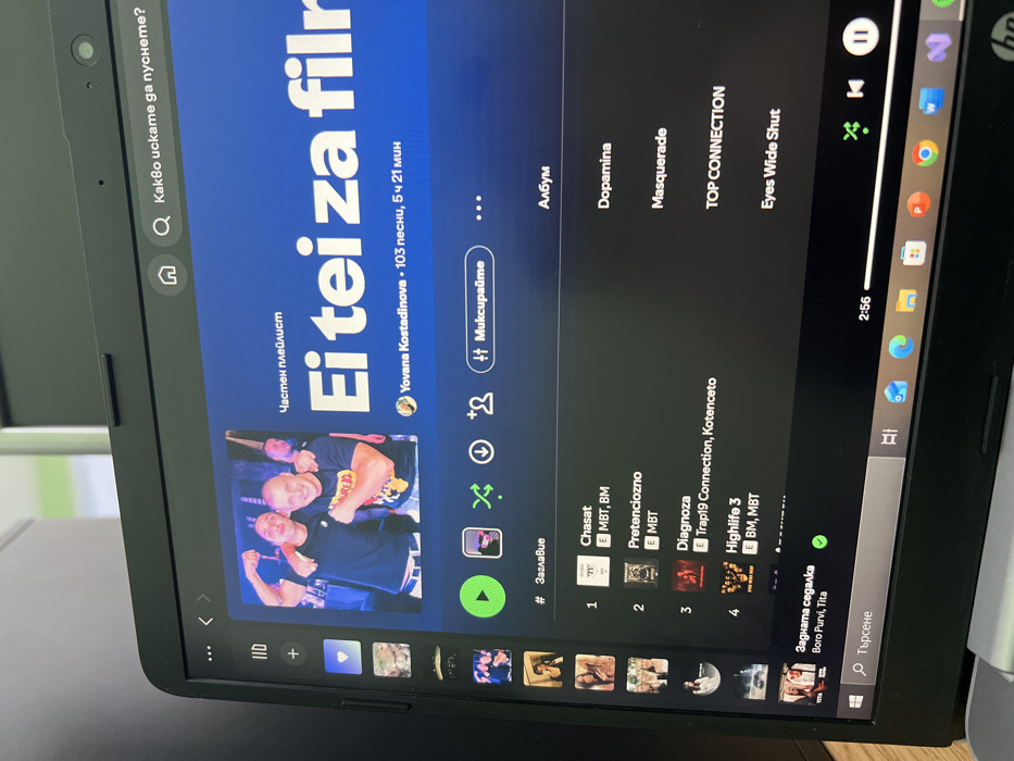 A black laptop displays the Spotify application in Bulgarian. The screen is primarily occupied by a playlist titled "Ei tei za film" ("This is for a film"), attributed to Yovana Kostadinova, containing 103 songs totaling 5 hours and 21 minutes. The playlist cover image features two smiling bald men: one on the left in a black t-shirt flexing his bicep, and one on the right in a dark t-shirt with a yellow graphic, his arm around the other man's shoulder. Below the cover, playback controls are visible, including a green play button and a shuffle icon. A tracklist displays four songs: "Chasat," "Pretenciozno," "Diagnoza," and "Highlife 3." The currently selected song at the bottom of the screen is "Задната седалка" by Boro Purvi, Tita, with a playback timestamp of 2:56 on the progress bar. The Windows taskbar is visible at the bottom of the laptop screen, showing various pinned application icons. The laptop's webcam is visible on the top bezel. The background behind the laptop is blurred, showing a light wall or surface to the left and a darker vertical object to the right, consistent with an indoor environment.