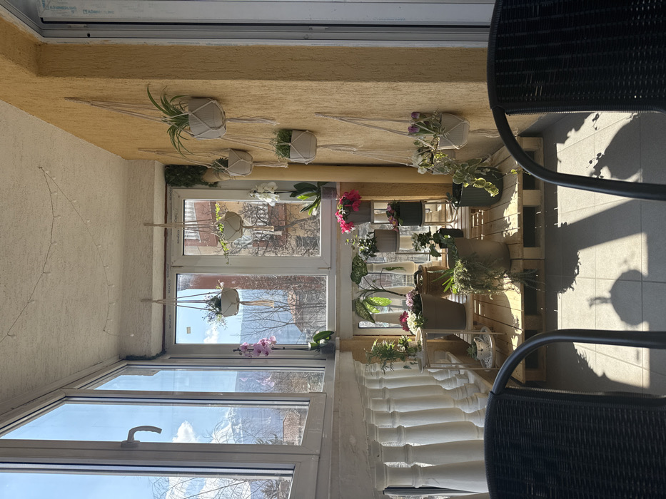 The image displays a brightly lit, enclosed balcony or loggia located in a residential area of Sofia, Bulgaria