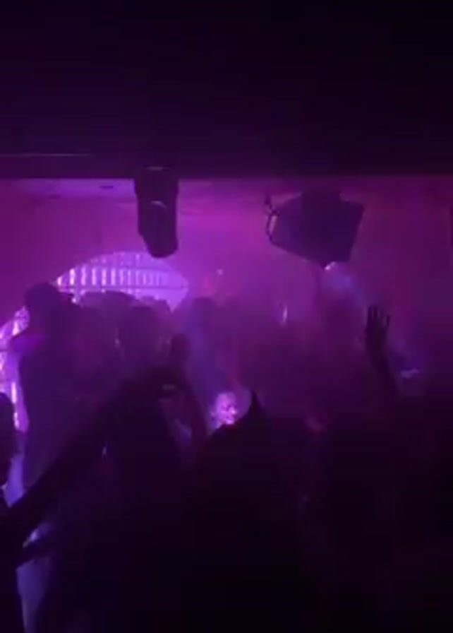 crowd of people dancing in a dimly lit room, with purple light illuminating the scene. Many are raising their hands in the air while some are recording the event with their phones. There are lighting fixtures and what appears to be a translucent brick wall.