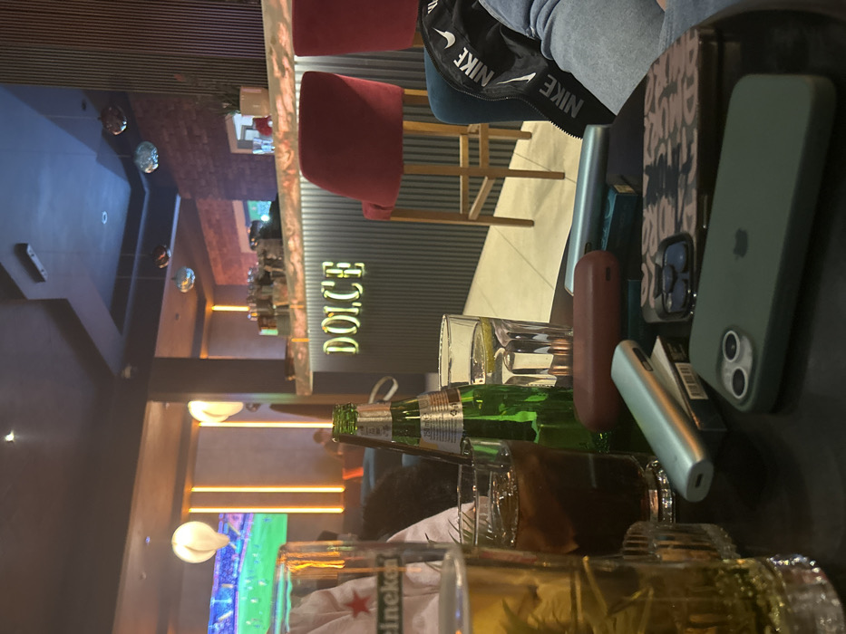 The image depicts the interior of Dolce Coffee & More, a modern bar/cafe located at Bulgaria Blvd 78, Kardzhali, Bulgaria. The scene is illuminated by artificial lighting, suggesting evening hours. In the foreground, a dark table is laden with multiple items. These include a glass of beer, a glass of a dark beverage with ice, a green glass beverage bottle (750ml capacity), and a glass of water containing a lemon slice. Two smartphones are present; one is a green-cased iPhone, and the other has a patterned case. Also on the table are two distinct vaping devices or portable chargers, one reddish-brown and one light blue/silver, alongside a pack of cigarettes. Partial views of two individuals are visible. To the left, a person's upper torso is present, clad in a light-colored garment. To the right, a person's leg, wearing light-colored trousers, and a black jacket with a white "NIKE" logo are discernible. The background features a contemporary bar area. A dark, vertically ribbed bar counter displays the illuminated golden letters "DOLCE." The counter's top surface is light-colored and underlit by an LED strip. Two unoccupied bar stools with red velvet seats and light wooden frames are positioned at the bar. Behind the counter, shelves hold various bottles and glassware, and a wall section displays a reddish brick pattern. To the left, a large flat-screen television prominently displays a live sports event, specifically a soccer or football match. The establishment's interior design incorporates dark walls, vertical amber-toned LED strip lighting, and several decorative hanging light fixtures, including spherical and petal-shaped elements. Blurred figures of other patrons are visible in the deeper background, seated at tables or lounges.