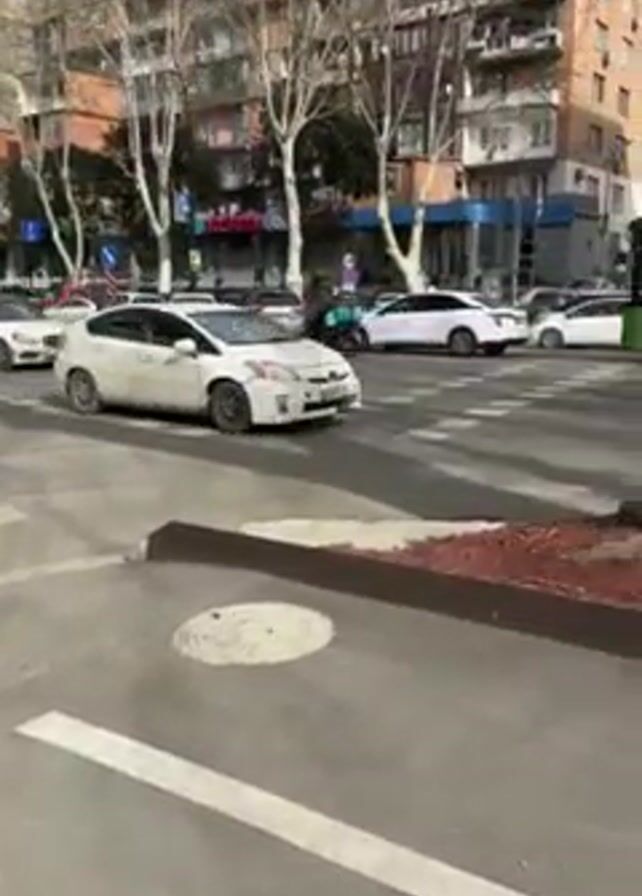 street corner in a city during daylight. A pedestrian crosswalk is visible with a traffic light pole beside it. Cars, including a white Toyota Prius and a white Mercedes coupe, and a green public transit bus are driving on the street. People are waiting to cross the street at the crosswalk. Buildings line the street in the background. A tree is also visible at the edge of the sidewalk.