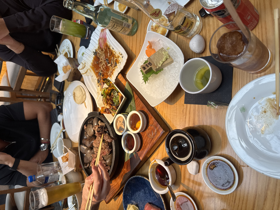 A table laden with diverse dishes: glazed meat, tofu on shaved ice, stir-fried vegetables, and assorted sauces. Drinks including green tea, soda, and alcohol bottles are scattered amongst the plates. Chopsticks pick at a dish, suggesting the meal is underway. A person wearing a watch and black shirt is seated at the table. Other people are partially visible at the edge of the frame, seated around the table, suggesting a group is dining together.