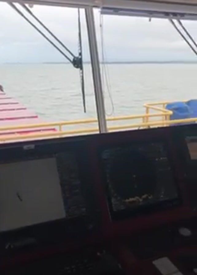 interior of a ship’s bridge. Looking out the front windows, one sees a long red structure, presumably another part of the vessel, extending forward. The sea is visible beyond it, under a cloudy sky. The bridge is equipped with a complex control panel featuring multiple screens, buttons, and a keyboard. A clipboard with papers sits on the console. The bridge also contains a door with an emergency exit sign, fire extinguishers, a first aid kit, and a storage cabinet. The overall environment appears functional and well-equipped for navigation.