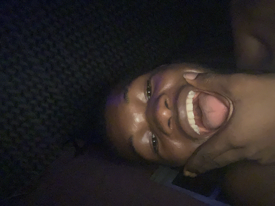 A person with dark skin and short hair is lying down and turned to the side, with their mouth wide open and teeth showing
