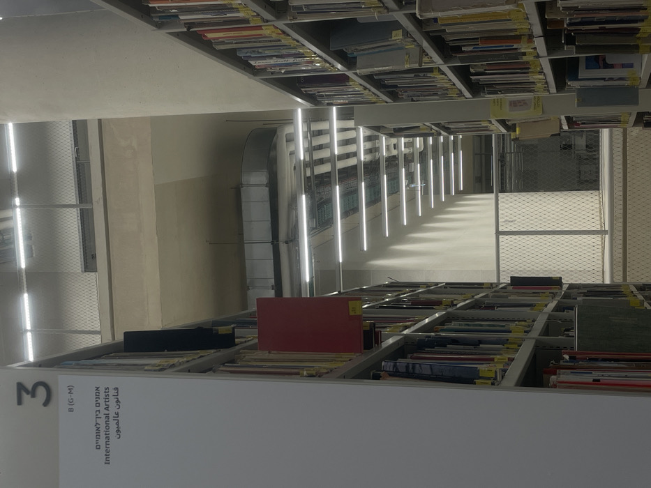 The image depicts an interior view of a modern library, identified as the National Library of Israel in Jerusalem. The scene shows a perspective down a wide aisle between two tall rows of bookshelves. On the left, a white shelf end panel features a black sign with the number "3" at the top, followed by "B (G-M)". Below this, the text "אמנים בין לאומיים" (International Artists) is printed in Hebrew, followed by "International Artists" in English, and then "פנונון עולמי" (World Art/Phenomenon) in Hebrew. The left bookshelf is filled with numerous books, primarily with light-colored spines, and a prominent red book with a yellow label is visible mid-shelf. The right bookshelf, parallel to the left, is also densely packed with books. Both rows of shelves recede into the distance. The central corridor reveals the library's multi-level architecture. The ceiling features exposed utility pipes and ducts, illuminated by multiple long, horizontal fluorescent light fixtures running parallel to the aisle. A light-colored concrete wall extends along the right side of the corridor, receiving illumination from more horizontal fluorescent lights mounted lower, creating a pattern of light and shadow. Above the main floor, a concrete beam spans horizontally. Further back, an upper level features a metal mesh barrier, behind which a dark opening or doorway is visible. On an even higher level, a curved, reflective barrier or railing is present on the right side. Another metal mesh barrier appears to cross the aisle further in the distance. No people are visible in the scene.
