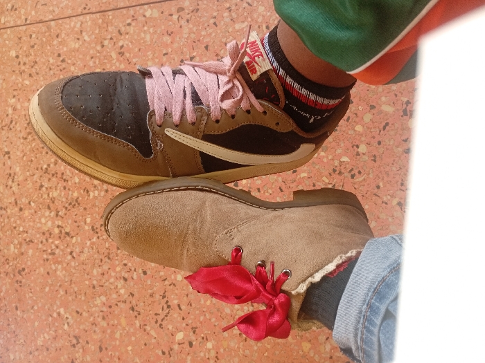 The image displays the lower extremities of two distinct individuals, specifically their feet adorned with footwear, positioned side-by-side with their inner surfaces in contact. The scene is viewed from an overhead perspective, focusing on the footwear and the immediate ground. The left foot is encased in a light tan or beige suede boot, resembling a chukka or desert boot style. A vibrant red satin ribbon is tied into a bow and functions as the primary shoelace for this boot. A visible cream or white faux fur or fleece lining protrudes slightly from the top edge of the boot. Below the boot, a dark-colored sock is visible, leading up to light blue denim jeans that are cuffed at the ankle. The right foot wears a high-top athletic shoe, characterized by multiple panels in shades of brown and black. The toe box is black and features perforations. A prominent white "swoosh" logo, indicative of the Nike brand, is visible on the shoe's side. The laces are pink and tied in a bow. The shoe's tongue displays a "NIKE AIR" label. A black ankle-length sock, detailed with red and white horizontal stripes or text, is visible. This foot is paired with green athletic pants, which feature an orange vertical stripe along the outer seam. Both feet are positioned on a floor composed of speckled, light orange or terracotta-colored tiles, characteristic of terrazzo or a similar composite flooring material. The exact location within the city of Nyeri, Kenya, is not visually determinable from the provided image.