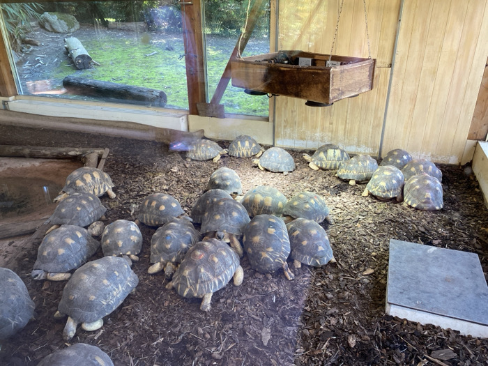 The image displays an indoor tortoise enclosure at the Parc Zoologique et Botanique de Mulhouse, France